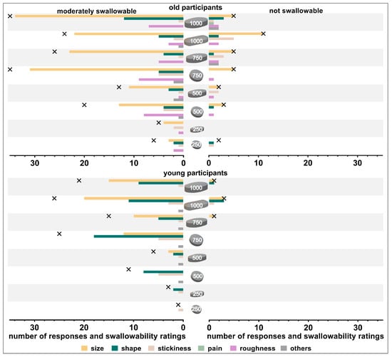 Number of responses and swallowability ratings (moderately swallowable shown on left panels and not swallowable shown on right panels). Crosses indicate the number of swallowability ratings (absolute numbers). Data are shown separately for old participants (upper panel) and young participants (lower panel).