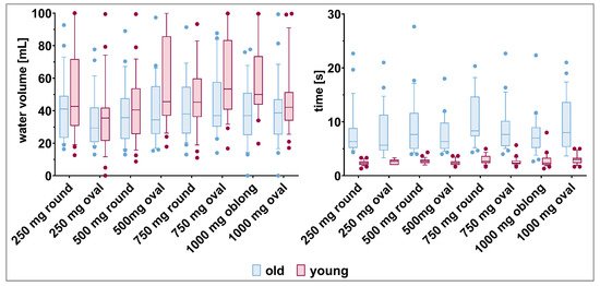 Water volume (left panel) and time (right panel) needed by old and young participants to swallow the tablets (mean, 10th, 90th percentile, and outliers are shown).