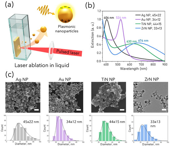 (a) Plasmonic NP synthesized by laser ablation in liquid method (LAL). (b) Normalized optical extinction spectra of Ag (black), Au (violet), TiN (green) and ZrN (blue) NP. (c) SEM images of plasmonic NP synthesized by LAL and their corresponding size distributions: Ag NP, Au NP, TiN NP, ZrN NP. Scale bar: 100 nm.