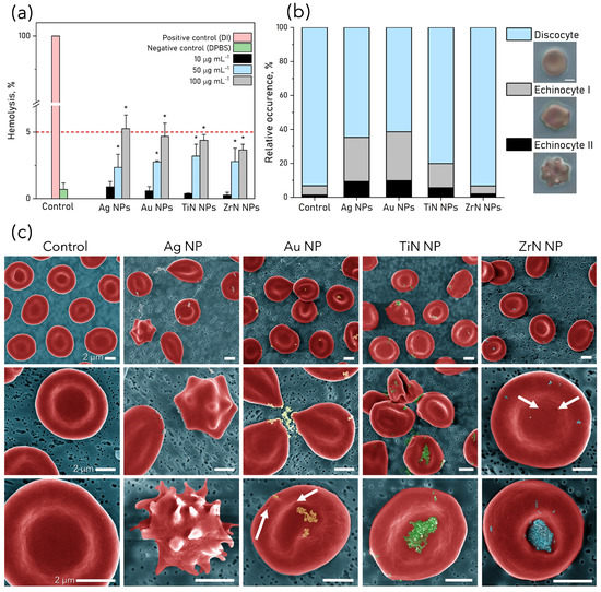 NP demonstrated concentration-dependent hemolytic activity, with a lower hemolysis rate of TiN and ZrN NP compared to Ag and Au NP. Hemolytic threshold indicating severe RBC damage was observed for all NP at concentrations exceeding g mL. Our results align with those from a previous study that showed TiN NP to be highly biocompatible towards RBC in vitro and in vivo [31] at concentrations up to g mL. The absence of hemolysis, however, does not exclude other adverse effects, such as RBC poikilocytosis, deformability or aggregation.