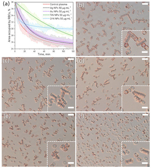 (a) Kinetics of RBC aggregation as the change of area occupied by RBC. Dotted lines are average data fitted by one-exponential decay with shaded areas representing the standard deviation. (b–f) Optical microscopy images of RBC incubated with NP with enlarged insets of aggregates after h in autologous blood plasma: (b) control, (c) Ag NP, (d) Au NP, (e) TiN NP, and (f) ZrN NP at concentration g mL. Scale: m (main images), m (insets).