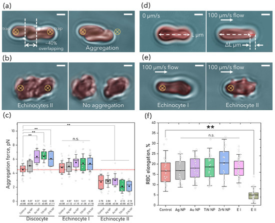 (a) OT measurements of RBC aggregation force after treatment with NP (g mL) for (a) discocytes and (b) echinocytes II. RBC relative elongation in fluid flow (100 m/s) for (d) discocyte and (e) echinocytes I and II. Scale bar: m. (c) Box plot of RBC aggregation force and (f) scatter interval plot of relative RBC elongation in viscous flow m/s. Data are expressed as mean ± SD, n = 20–30, ** p < 0.05, ns: non-significant, in one-way ANOVA, followed by Tukey’s post hoc test compared to control. Center lines show the medians; square dots represent the means; outliers and individual data points are represented by dots; box limits indicate the 25th and 75th percentiles; whiskers show SD.