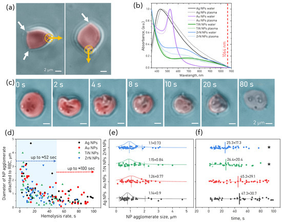 The time required for RBC to burst was almost twice as fast for TiN and ZrN NPs (up to s) compared to longer times (up to s) for Au and Ag NP. The mean sizes of NP agglomerates between the samples were not statistically different (Figure 5e), but hemolysis was reached faster for larger NP agglomerates (Figure 5d). The mean times (Figure 5f) are two-fold shorter for TiN and ZrN NP. Therefore, TiN and ZrN NP have higher plasmonic efficiency compared to their noble counterparts. The plasmonic peaks of TiN NPs and ZrN NP are also red-shifted compared to their counterparts, having an extended peak beyond nm, closer to the trapping wavelength.