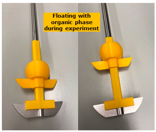 The floating paddle was designed to automatically adjust the position of the upper paddle following the fluid level during the transfer experiment. The floating paddle comprises an orifice with a square-shaped cross-sectional area. Furthermore, a sleeve was designed to be attached to the original shaft of the paddle without additional modifications or tools (Figure 2). After assembly, the shaft constrains the possible motion of the floating paddle in x- and y-direction synchronizing the rotational movement to the original paddle located at the bottom of the vessel. Motion in the z-direction, along the shaft, on the other hand, is not constrained, allowing upward and downward motion of the floating paddle. The buoyancy of the floating part was adjusted empirically so that the upper edge of the paddle was located 1 cm below the level of fluid. In the case of varying organic fluid volumes, the paddle position towards the aqueous/organic interface is different. Therefore, the distance between the blade and buoyancy body was adjusted empirically to allow a comparable position when using different organic fluid volumes. Thus, hydrodynamic differences should be reduced.