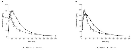 The area under the concentration-time curve (AUC) of the explored time frame was calculated based on the concentration-time profiles obtained from the in vitro transfer experiments.