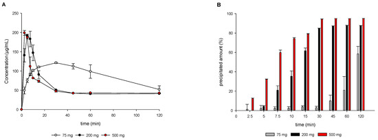 Figure 6B shows the precipitated amount of drug in the intestinal compartment in %, which was calculated based on the theoretically transferred drug amount at every sampling time point (see also Section 2.5). For the 75 mg OS dose, the precipitated amount was ≤20% until 60 min. Pronounced precipitation of the 75 mg dose occurred from the sampling time point of 60 min to 120 min. In contrast, for the higher doses of 200 mg and 500 mg OS, the overall precipitated fraction was found to be much higher, with >80% of the drug precipitated after 30 min.