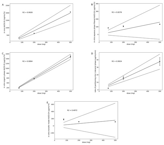 In vivo area under the plasma concentration-time curve of 75, 200, and 500 mg MSC-A as OS during first 2 h ((A)); slope = 3.9849; p = 0.0036). In vitro aqueous phase ((B); slope = 0.3191; p = 0.0902) and organic phase ((C); slope = 2.9639; p = 0.0003) area under the drug concentration-time curve during first 2 h, and rate of linear partitioning into organic phase between 7.5 and 20 min ((D); slope = 0.075; p = 0.0038) during in vitro DTPS experiments using 75, 200, and 500 mg MSC-A as OS. In vitro transfer model area under the drug concentration-time curve data obtained from experiments using 75, 200, and 500 mg MSC-A as OS ((E); slope = 0.3122; p = 0.2949). Dashed lines represent the upper and lower 95% confidence interval. For (B,E), data were fitted via a linear regression model for consistency purposes only. For aqueous phase data and associated saturated concentrations, the analysis results in poor R2 and p values of slope applying a linear model.