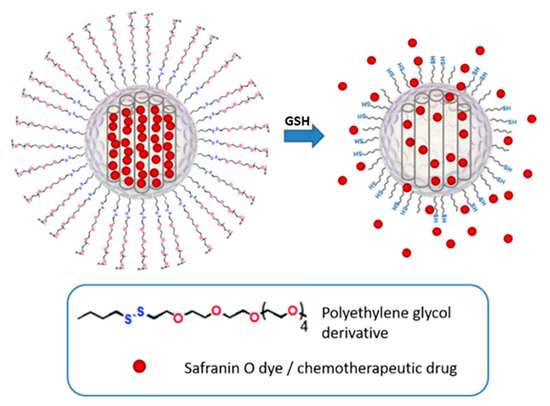 Dye release studies were carried out with both S2 and S3 to test the gating mechanism. The disulfide bonds in the PEG chains on the nanoparticle surface were expected to be cleaved by a reducing medium. In a typical experiment, a suspension of the material in water at pH 7.5 was prepared, with and without the addition of GSH (10 mM) as a release stimulus. This concentration of GSH was chosen considering that normal intercellular GSH levels are 1–10 mM and that in tumor cells they can even increase up to 2–10 times [34,35]. At given time points, aliquots were taken and centrifuged to remove the nanoparticles. The release was monitored by measuring the fluorescence signal of the safranin O fluorophore or of the DOX at 585 nm (λex = 520 nm) and 557 nm (λex = 495 nm), respectively (Figure 3). An initial release, up to 20% of the maximum release, was observed, likely due to the residue of cargo molecules on the surface of the nanoparticles. In both cases, a poor release was seen in the absence of the stimulus, while the presence of GSH triggered a fast delivery of the loaded cargo, achieving 90% of the maximum release within a few minutes.