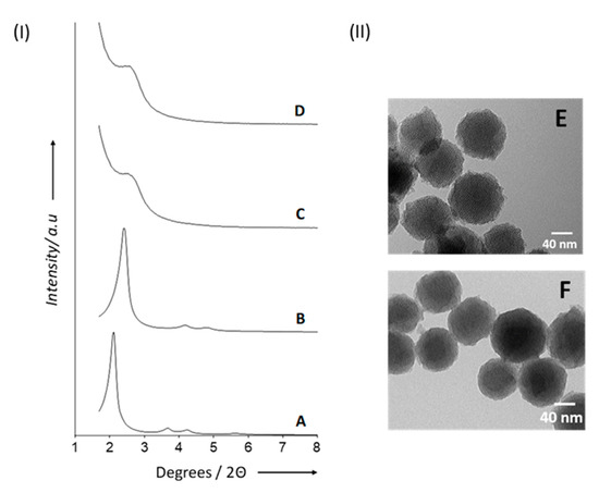 (I) Powder X-ray diffraction patterns of as-synthesized MSNs (A), calcined MSNs (B), solid S1 (C), and solid S2 (D). (II) TEM images of solids S2 (E) and S3 (F).