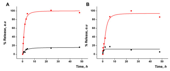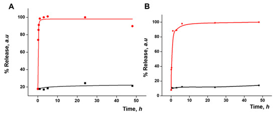 Kinetic release profile of safranin O delivered from S2 (A) or of DOX delivered from S3 (B) in water in the absence (black) and in the presence (red) of GSH (10 mM).