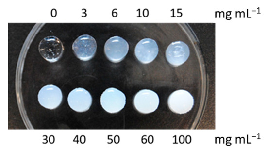 In order to study the capability of in situ-forming gels to encapsulate nanoparticles, a series of hyaluronic acid gels were first prepared with different amounts of calcinated MSNs. As shown in Figure 4, even with very high amounts of MSNs (up to 100 mg mL−1) added to the hyaluronic acid precursor, gels could be formed. In further experiments, an intermediate amount of MSNs (6 mg mL−1) was incorporated into HA gels and chitosan/β-glycerophosphate gels.