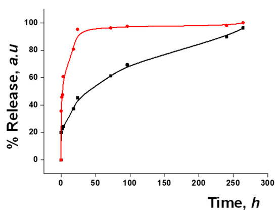 Similarly, some examples of MSNs being incorporated into a polymer matrix for release applications have been reported [6,7,8,9,10,11,12]. In the case of Zhu et al. [9], the incorporation of MSNs into a chitosan polymer to form a composite hydrogel was described. The authors found that the presence of gentamicin-loaded MSNs in the gel favored the sustained release of the drug over time, which did not occur when the gentamicin was directly loaded into the gel. Zuñiga and co-workers described the incorporation of rhodamine B (RhB)-loaded MSNs into a thermoresponsive poly(N-isopropylacrylamide) (PNIPAAm) hydrogel [10]. At temperatures higher than the lower critical solution temperature, the polymer chains collapsed and blocked the pores of the MSN materials, whereas at low temperatures the composite prevented the burst release that occurred when RhB was freely loaded into the polymer. Another example was developed by Zhao et al., who described a system based on ibuprofen-loaded MSNs embedded into a chitosan hydrogel to be used in titanium implants [11]. The mixture of MSNs and chitosan was deposited into a titanium plate, and the ibuprofen release profile was found to be responsive to pH changes and to the application of an electric field. Finally, Hu and co-workers incorporated MSNs loaded with bovine serum albumin into an alginate/hyaluronic/chitosan gel and successfully tested the composite in simulated gastrointestinal media [12].