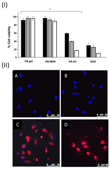 (I) Quantification of viable cells as measured by WST-1 assay at 24 h (black), 48 h (grey), and 72 h (white bar). Three independent experiments containing triplicates were performed. Statistically significant differences were observed among the cells treated with HA-S3 when compared to cells treated with the control HA gel or HA-MSN (Student’s t test, * = p < 0.05). The results are expressed as mean ± se. (II) Confocal microscope images corresponding to U271 cells treated for 24 h with HA gel (A), HA-MSN (B), HA-S2 (C), and HA-S3 (D) loaded with 6 mg mL−1 of the corresponding nanoparticles.