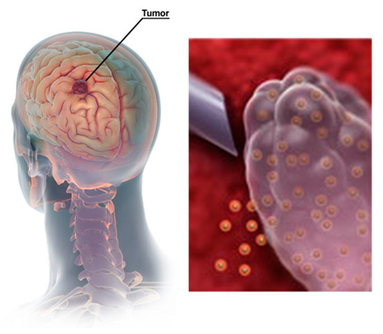 In the context of malignant gliomas, an exciting purpose of such combination strategies is the implantation of hydrogels containing drug-loaded MSNs in the tumor environment to shrink the size of the lesion in hard-to-reach areas or, following the surgical removal of the tumor, to prevent metastasis or cancer recurrence (Figure 8). Surgery, indeed, rarely removes all tumor cells in glioma because of their invasive nature; hence, postoperative treatment is frequently required [43]. One advantage of local delivery is that the therapeutic dose can be maintained at the tumor site. On the other hand, the MSNs guarantee a continuous and extended delivery of drugs to the surviving malignant cells. As a result, the treatment of GBM using this combination is highly promising.