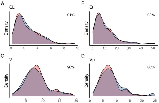 Kernel density estimates for the posterior (blue) and simulated (red) for (A) clearance from the central compartment (CL), (B) inter-compartmental clearance (Q), (C) central volume (V), and (D) peripheral volume (Vp). The overlap coefficient for empirical distributions between the posterior and simulated parameter distribution is shown in the top-right corner.