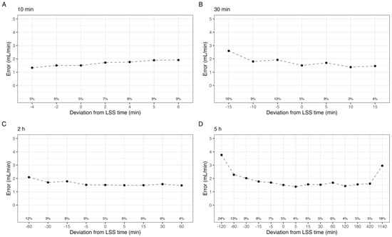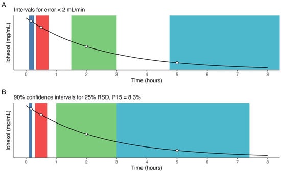 Based on the results of deviation in both individual and multiple sample points, two approaches to empirical sample windows were used. For deviation in individual sample time, assuming otherwise no deviation in the remaining sample points, the time intervals for which the mean error was lower than 2 mL/min may be used. For deviation across all sample times, the level of RSD associated with an acceptable P15 was used to calculate empirical sample windows for all sample points by calculating the 90% confidence interval for the normal distribution centered at each sample point, truncated to avoid overlap between samples.