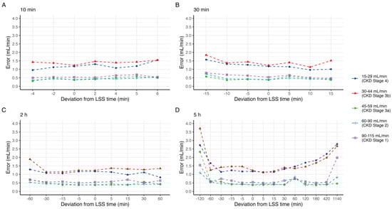 Median absolute error in predicted mGFR by deviation in sample time at point (A) 10 min, (B) 30 min, (C) 2 h, and (D) 5 h, grouped by CKD stage.