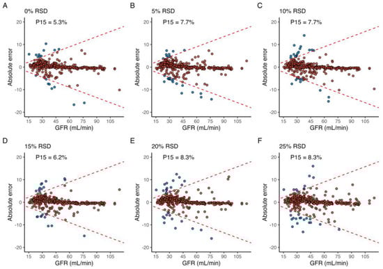 Applying random, normally distributed noise with an RSD equal to 5 and 10% across all sample times led to a P15 of 7.7% in both cases, and a maximum P15 of 8.3% was achieved in the case of an RSD of both 20% and 25% (Figure 4). For the simulated profiles with CKD stage 1 (GFR 90–115 mL/min), P15 was 0% for all levels of RSD, and a maximum of 4.1% at 5% RSD for profiles with GFR 60–90 mL/min. In contrast, simulated profiles with GFR between 45–55 mL/min, 30–44 mL/min, and 15–15 mL/min incurred a P15 of 7%, 14%, and 10% at 25% RSD, respectively.
