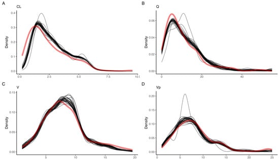 Kernel density estimates for all empirical deviations in time (black), compared to the observed posterior (red) for (A) clearance from the central compartment (CL), (B) inter-compartmental clearance (Q), (C) central volume (V), and (D) peripheral volume (Vp).