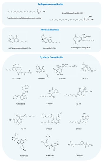 Marijuana, cannabis, hemp and weed are commonly used terms for Cannabis sativa, which has been used since ancient times (2700 a.c.) []. Due to its narcotic and psychotropic effects, it was consumed mainly as a recreational drug in early years, which undermined its consideration as a potential therapeutic [,]. However, its numerous pharmaceutical properties prompted further research on cannabis as a medicinal product, which proved to be prolific [,]. As a result, in the last years, different institutions have reviewed the pharmacological properties of cannabis, which has led to its decriminalization and availability for therapeutic use [,,]. Some of the diseases for which cannabinoids have demonstrated therapeutic activity include neurological disorders, muscle spasticity, multiple sclerosis symptoms, spinal cord lesions and epilepsy, to mention a few []. Still, nowadays, the most well documented therapeutic benefit of cannabinoids, and therefore their wider prescription, is in the prophylaxis and management of nausea and sickness related to antineoplastic chemotherapeutics []. Nonetheless, several synthetic cannabinoids have entered the international pharmaceutical market, such as nabilone and dronabinol []. Some examples of FDA-approved products are Epidiolex® (cannabidiol (CBD)) for the treatment of refractory epilepsy-associated seizures, Marinol® and Syndros® (Dronabinol, synthetic Δ9-THC), both for chemotherapy-induced nausea and vomiting and anorexia in patients with acquired immune deficiency syndrome (AIDS).