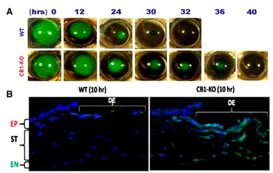 CB1 activation promoted mouse corneal reepithelialization. (A) Time-dependent epithelial wound healing was evaluated following epithelial debridement with an Algerbrush in control (WT) and CB1−/−mice. The wound area was identified based on the extent of fluorescein staining. Corneal reepithelialization in the WT group required 30 h, whereas it was delayed by 10 h in the CB1−/− group since closure occurred at 40 h. (B) Immune cell infiltration was assessed at 10 h in WT (left panel) and CB1−/− (right panel). CD 11b green immunostaining in the remaining deepithelialized area (DE) was only evident in the CB1−/− (KO) cornea. Scale bar = 50 μm. Reproduced from Yang et al. [].