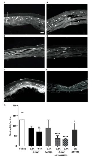 Δ8-THC exerted antinociceptive and anti-inflammatory effects after topical administration in a hyperalgesia mouse model. The figure shows neutrophil expression in cauterized corneas at 6 h post-injury following the topical treatments of drug or vehicles and capsaicin stimulation. Representative images of transverse sections of the central cornea from (A) vehicle-treated corneas, (B) 0.2% Δ8-THC-treated corneas, (C) 0.5% GAT229-treated corneas, (D) 2% GAT228-treated corneas, (E) 0.2% Δ8-THC + 0.5% GAT229 and (F) 0.4% Δ8-THC + 0.5% GAT229. (G) Effects of topical treatment of WT-cauterized eyes with (0.2 and 0.4%) Δ8-THC, 0.5% GAT229, 2% GAT228 or 0.2% or 0.4% Δ8-THC + 0.5% GAT229 (n = 4–6 per group) in neutrophil infiltration compared to vehicle-treated eyes (n = 7). GAT211 CB1: allosteric ligand; GAT228 and GAT229: GAT211 enantiomers. Values represent the means ± SD. Arrow in (A) points to one of many infiltrating neutrophils. Scale bar: 50 µm. For statistical analysis one-way ANOVA with Dunnett’s post hoc test (compared to the vehicle) was used. * p < 0.05, ** p < 0.01, **** p < 0.0001. Reproduced from Thapa et al. [].