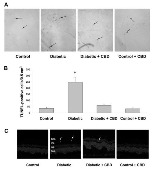 - El-Remessy, A.B.; Al-Shabrawey, M.; Khalifa, Y.; Tsai, N.T.; Caldwell, R.B.; Liou, G.I. Neuroprotective and Blood-Retinal Barrier-Preserving Effects of Cannabidiol in Experimental Diabetes. Am. J. Pathol. 2006, 168, 235–244. [Google Scholar] [CrossRef]