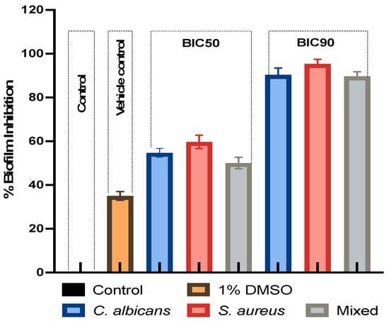 The most frequently isolated fungal and bacterial pathogens from bloodstream infections are C. albicans and Staphylococcus species. Over 20% of bloodstream infections caused by C. albicans are polymicrobial, with S. epidermidis and S. aureus being the first and the third most repeatedly co-isolated commensal microbes, especially in immunocompromised patients []. These pathogenic microbes are known for their propensity to form biofilms inside the host and on abiotic medical devices. Therefore, the interaction between these microbes may raise virulence and drug resistance. Hence, inhibiting these mixed biofilms is the most important factor in developing an appropriate treatment strategy.