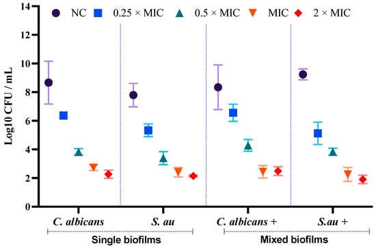 Viability assay of single- and mixed-microbial biofilms at different concentrations of the LMEKAU0021. The polymicrobial biofilm cells of C. albicans and S. aureus (C. albicans+, viable cells of C. albicans in mixed biofilms; S. aureus+, viable cells of S. aureus in mixed biofilms). Negative control (NC), untreated single and mixed biofilm.