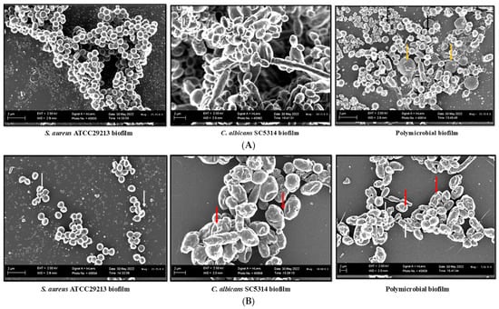 SEM images of mono- and polymicrobial biofilms formed by C. albicans and S. aureus. (A) untreated; (B) treated with LMEKAU0021 at BIC90. Black and yellow arrows show the presence of S. aureus and C. albicans, respectively, in the untreated control mixed biofilm. White and red arrows point out the deformity in the S. aureus and C. albicans respectively in the LMEKAU0021 treated mixed biofilms.