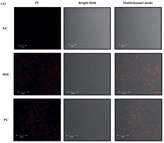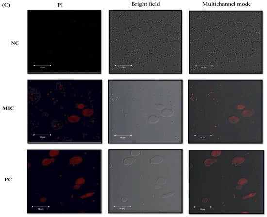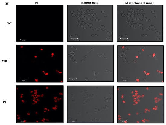 For insight into antimicrobial mechanisms, the cellular membrane integrity of C. albicans and S. aureus (single and mixed culture conditions) was evaluated by propidium iodide (PI, Sigma-Aldrich, USA) staining method by following the protocol described elsewhere []. Briefly, both bacterial and yeast cells, individually and mixed, were inoculated in respective media and incubated at 37 °C, 150 rpm for 24 h. The cells were then spun, and pellets were washed with PBS, followed by adding fresh SDB and exposed to the LMEKAU0021 (MIC) at standard conditions for 4 h. For this purpose, H2O2 (30%) and unexposed cells were used as positive and negative controls, respectively. Following exposure, cells were given PBS washing, stained with PI (30 μM) and kept at room temperature for 30 min away from light. Post-staining, cells were collected, washed with PBS and mounted on the slides, and viewed under fluorescence microscopy (Zeiss Laser Scanning Confocal Microscope (LSM) 780 and Airyscan (Carl Zeiss, Inc.).