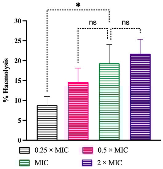 The hemolytic assay was performed on horse red blood cells (RBC; NHLS, Johannesburg, South Africa) to evaluate the cytotoxic effect of the LMEKAU0021 using a previously reported method []. Briefly, RBC suspension was prepared in PBS, and was treated with different concentrations of LMEKAU0021 (0.25 × MIC, 0.5 × MIC, MIC and 2 × MIC) for 4 h at 37 °C. After incubation, samples were centrifuged (2000 rpm for 10 min). The supernatant was transferred to a 96-well microtiter plate to measure the absorbance spectrophotometrically (450 nm; SpectraMax iD3 multi-mode microplate reader, Molecular Devices, CA, USA). Triton X-100 (1%) and PBS were used as positive and negative controls, respectively, and the following equation was applied to calculate the percentage of hemolysis: