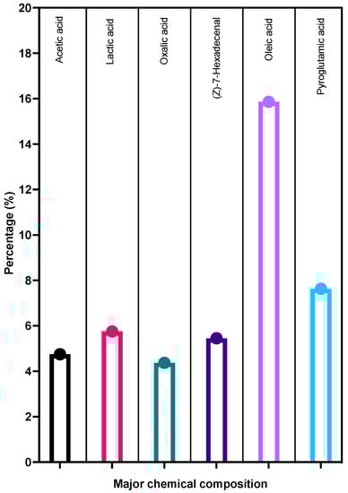 The GC-MS chemical composition of LMEKAU0021 dervied from Limosilactobacillus fermentum KAU0021. The bars depict compounds of major composition found in LMEKAU0021.