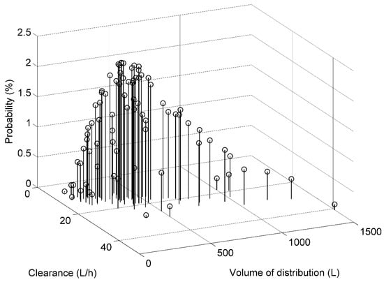 Discrete prior distribution of imatinib clearance and volume of distribution in a typical patient. The patient is a male with CML, his age and body weight are 50 years and 70 kg, respectively.
