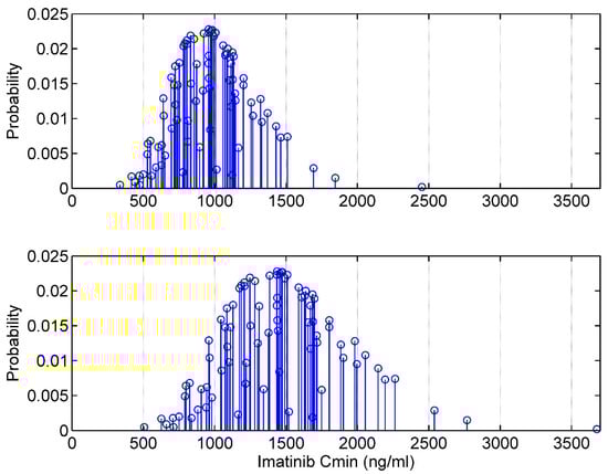 A priori discrete distribution of imatinib trough concentration at the steady state in a virtual patient. Upper panel, 400 mg/24 h; lower panel, 600 mg/24 h. The patient is a 60-year-old woman, her weight is 60 kg and she has CML.