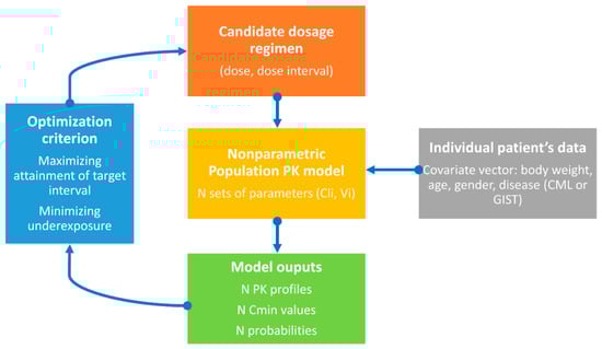 In his allocution in 2015, President Obama also stressed the importance of “figuring out the right dose of medicine” in personalized medicine (https://obamawhitehouse.archives.gov/node/333101, accessed on 12 December 2022). In line with other researchers [9,10], we believe that precision dosage design of drugs has been overlooked in personalized medicine so far, and that major progress can be made in this area. While selecting the right drug for a given individual based on his/her characteristics is important, prescribing the best dose of such drug also matters to optimize drug response. Precision dosing notably includes drug dosing based on models to better consider PK-PD variability and better achieve target objectives in a goal-oriented approach. This can be performed both a priori (without any concentration measurement) and a posteriori, with a further readjustment of the dosing schedule based on the patient’s actual exposure. In this paper, we aim at showing how a priori precision dosing can be applied using imatinib as an illustrative example.