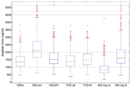 In this study, we applied the TID method for imatinib dosing and compared its performance with that of other dosing approaches in simulated patients and using real patients’ data. When targeting the imatinib Cmin interval of 1000–2000 ng/mL, the TID approach was effective in maximizing the rate of target attainment. However, in this example, it did not perform better than the traditional model-based approach targeting the mid-interval (TCD). This result may not be generalizable as the ability to achieve a target interval can depend on several features including the variability of PK parameters and the width of the target interval. However, the TCD method should be effective when the condition of a relatively symmetrical distribution of the exposure around the median is fulfilled, while the TID approach may be superior in case of heavy-tailed distribution of the exposure index [28]. The latter also has the unique characteristic of accommodating single bound intervals, and so can minimize under- or overexposure. In this application to imatinib, the TCI-ODLmin and -ODL5% methods consistently minimized the proportion of Cmin < 1000 mg/L. However, these methods were associated with the highest dosage requirements and higher rates of Cmin > 2000 ng/mL, which may raise safety concerns. This illustrates the limitations of any dosing method based on population data only and the need to perform TDM for individual control of drug exposure during treatment [27,41].