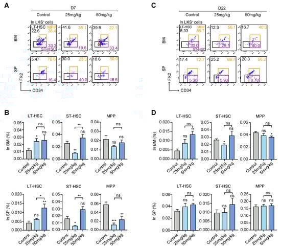 To identify the effect of the targeted drug on HSPCs, we used flow cytometry analysis to compare differences in the percentages of long-term hematopoietic stem cells (LT-HSCs), short-term hematopoietic stem cells (ST-HSCs), and multipotent progenitors (MPPs) between the control group and treatment groups. It is well known that CD34 and Flk-2 markers are usually used in combination with Lin−c-Kit+Sca-1+ (LKS+) to sort LT-HSCs (CD34−Flk-2−LKS+), ST-HSCs (CD34+Flk-2−LKS+), and MPPs (CD34+Flk-2+LKS+) [,] (Figure 2A,C). On day 7, in the BM, LT-HSCs in the low-dose group were significantly increased compared with the control group, while ST-HSCs in the low-dose group were reduced compared to the control group. However, there was no difference in MPPs among each group. On day 7, in the SP, LT-HSCs in the high-dose group were significantly increased compared with the control group. ST-HSCs in the low-dose group were reduced compared to the control group. MPPs were inhibited in both the high- and low-dose groups relative to the control group. These results indicate that the targeted drug mainly affected the MPP proportion of extramedullary hematopoiesis in the early stage (Figure 2B).