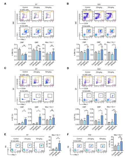 In the SP, on day 7, CMPs and GMPs were significantly increased in both treatment groups, and the effect occurred in a dose-dependent manner (Figure 3C). The levels of CMPs and GMPs in the low-dose group returned to the control level on day 22, while those in the high-dose group remained significantly higher than those in the control group (Figure 3D). In addition, there was no significant difference in the levels of Mac-1+Gr-1+ cells among the groups on day 7, and by day 22, the high-dose group showed a much higher level than the control group (Figure 3C,D). Based on the above results, we concluded that in extramedullary hematopoiesis, CMP was mobilized in the early stage and recovered in the late stage.