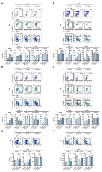 For intramedullary hematopoiesis in the late stage, differences in the MEP and relatively mature CD45−CD42d+ subpopulations in both treatment groups had no statistical significance compared to the control group. Moreover, the percentages of intermediate-stage subpopulations, such as CD45+CD41− in both the high- and low-dose groups, CD45−CD41+ in the high-dose group, and CD45−CD41+CD42d+ in the low-dose group, were higher than those of the control group (Figure 4C). However, there was no obvious difference among the percentages of intermediate-stage subpopulations in these three groups in extramedullary hematopoiesis (Figure 4D).