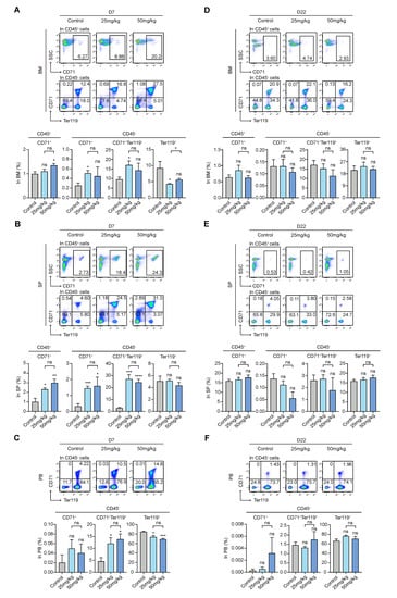 The presence of CD45+CD71+, CD45−CD71+, CD45−CD71+Ter119+, and CD45−Ter119+ subpopulations indicates that erythroid cells have gradually differentiated and are mature [,]. On day 7, in intramedullary hematopoiesis, we found a greater increase in CD45+CD71+ cells in the high-dose group compared to the control group. The percentage of CD45−CD71+ and CD45−CD71+Ter119+ cells was increased in both treatment groups and was significantly different between the low-dose group and the control group. However, CD45−Ter119+ cells decreased in the treatment groups, and their levels were significantly different between the low-dose group and the control group (Figure 5A). On day 7, in extramedullary hematopoiesis, the percentage of CD45+CD71+, CD45−CD71+, and CD45−CD71+Ter119+ cells was significantly increased in both treatment groups relative to the control group, while the levels of CD45−Ter119+ cells were almost the same in the three groups, with no statistical significance (Figure 5B). In terms of fold change, changes in the subpopulations of extramedullary hematopoiesis were greater compared with those of intramedullary hematopoiesis (Figure 5A,B). In the peripheral blood, CD45−CD71+Ter119+ cell levels in the treated groups were higher than those in the control group on day 7, while CD45−Ter119+ cells were decreased in the treatment groups compared with the control group (Figure 5C). Interestingly, on day 22, whether in the BM, SP, or PB, the erythroid lineage cells in the treatment groups returned to their control group levels, with no significant differences compared with the control group (Figure 5D–F). Combining the results of the routine blood RBC count (Figure 1C) and MEP subpopulations, S63845 reduced the early RBC count and significantly inhibited the levels of intramedullary CD45−Ter119+ cells; moreover, the early differentiated progenitor cells of this lineage play a compensatory role in extramedullary hematopoiesis.