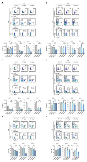 The differences in the percentages of CLPs in BM showed no significant difference among the three groups on day 7. However, the proportions of CD3e+, B220+, and NK1.1+ cells in the treated group were all significantly inhibited on day 7 in BM compared with the control group (Figure 6A). On day 22, in the BM, CD3e+ and NK1.1+ cells in both treatment groups were returned to their control group levels, while the proportion of CLPs decreased in the high-dose group relative to the control group. Furthermore, B220+ cells were still reduced in both the 25 mg/kg and 50 mg/kg groups on day 22 (Figure 6B).