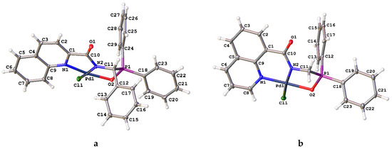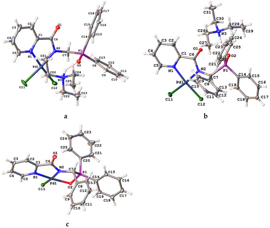 The structures of complexes 2a,b and 3b in the solid state were further supported by the results of XRD analysis (Figure 3). Table 1 lists some important bond lengths and angles for these cyclopalladated derivatives and ligand 1b. As anticipated, in compounds 2a,b the palladium ion is coordinated by two nitrogen atoms of the deprotonated picolinylamide unit and two chloride ligands. The resulting complex anions are bound with triethylammonium cations through hydrogen bonds between the P=O group and NH+ moiety (N…O 2.715(3) Å, NHO 149.24(14)° (2a), N…O 2.776(7) Å, NHO 160.4(5)° (2b)). The formation of the ionic pairs in 2b is also assisted by C–H…O contacts between the C=O group of the anion and CH2 group of the cation (C…O–3.171(10) Å, CHO 122.9(5)°). In 3b, the deprotonated amide ligand adopts a tridentate coordination mode, additionally binding with the metal center through the oxygen atom of the phosphoryl group. One chloride ligand completes the coordination sphere of the Pd(II) ion. The more diversified environment leads to the more distorted square-planar geometry around the metal center in pincer complex 3b compared to its monometallocyclic counterparts 2a,b, although the main geometric parameters that involve coordination bonds in these compounds are quite close and lie within the expected ranges. The coordination of the phosphoryl group in 3b results in a significant elongation of the P=O bond (1.536(2) Å vs. 1.4843(11) Å in free ligand 1b). The N,N-chelation in complex 2b only slightly affects the bonding parameters of the picolinylamide unit, whereas in the case of pincer complex 3b, the marked changes are observed for both N1–C1 bond in the pyridine ring and C1–C6 bond between the carbonyl group and heterocyclic moiety. This is likely to be connected with the presence of a system of two fused metallocycles which, in turn, adopt envelope conformations (with atoms Pd1 and P1 deviating by 0.283(5) and 0.618(3) Å from the mean planes of other atoms in the N,N- and O,N-chelate rings, respectively), unlike the planar metal-containing cycles in complexes 2a,b. In the crystal of 2a, the C=O group forms C–H…O contacts with one of the phenyl substituents and CH2 group (C…O 3.451(3)–3.548(3) Å, CHO 146.56(14)–157.54(15)°) to produce centrosymmetric dimers; the formation of the 3D-framework is completed by weaker van der Waals contacts. In the case of palladocycle 2b, the pyridine units form parallel-displaced stacking interactions (with the interplane angle of 0° and the inter-centroid and shift distances of 3.7162(6) and 1.720(13) Å, respectively) that pack the anions into centrosymmetric dimers; those are held together by weaker van der Waals contacts to produce a 3D-framework. In the crystal of pincer complex 3b, both the P=O and C=O groups form C–H…O contacts with the hydrogen atoms of one (C…O 3.264(4) Å, CHO 137.2(2)°) and two (C…O 3.257(4)–3.315(4) Å, CHO 142.4(2)–160.3(2)°) phenyl substituents, respectively. The resulting zigzag chains along the crystallographic axis c are held together by weaker van der Waals contacts, creating a 3D-framework. The fragments of the crystal packing of the complexes explored are depicted in Figure S47 in the SI.