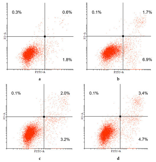 Finally, the comparable levels of cytotoxic activity of most of the complexes obtained in this study against the parental cell lines HBL100 and K562 and their doxorubicin-resistant subclones HBL100/Dox and K562/iS9 show the prospects of the development of new anticancer agents based on the related derivatives that would be able to circumvent drug resistance. This is also confirmed by the results of flow cytometric studies on apoptosis inducing ability of the most active palladocycle (complex 3b), performed using the Annexin V-FITC/PI double staining assay at the compound concentration of 10 μM. The diagrams presented in Figure 5 show that the total percentages of early (lower right quadrant) and late (upper right quadrant) apoptotic cells were almost the same for parental cells K562 and their resistant analogs K562/iS9. This suggests that the cyclopalladated complexes of phosphoryl-functionalized carboxamides represent promising objects for further detailed investigations of their anticancer potential.