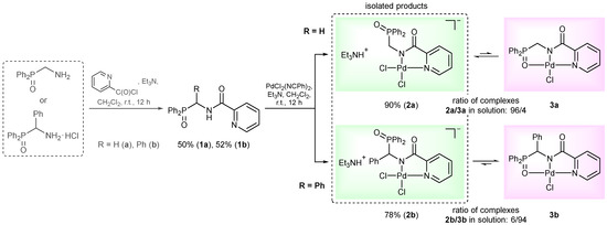 If not noted otherwise, all manipulations were carried out without taking precautions to exclude air and moisture. Dichloromethane was distilled from P2O5. Triethylamine was distilled over sodium. (Aminomethyl)diphenylphosphine oxide was synthesized by the Michaelis–Arbuzov reaction between Ph2POEt and N-bromomethylphthalimide followed by the hydrolysis of the protecting group according to the published procedure [40]. [Amino(phenyl)methyl]diphenylphosphine oxide hydrochloride was obtained by treating hydrobenzamide with diphenylphosphine oxide generated in situ from Ph2PCl [41]. Picolinyl chloride was synthesized by the reaction of picolinic acid with SOCl2 in the presence of Et3N [42] and immediately used in a further step without purification. All other chemicals and solvents were used as purchased.