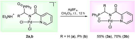 The complexing features of the resulting functionalized picolinylamides towards Pd(II) ions were studied through their interaction with PdCl2(NCPh)2, which is commonly used as a versatile cyclopalladating agent. The reactions were performed under mild conditions, in dichloromethane at room temperature in the presence of Et3N. The latter was necessary for trapping HCl liberated during metalation in order to prevent the possible ligand deactivation. Although the subsequent ex situ analysis of the isolated products confirmed the presence of an N,N-chelated moiety, i.e., the occurrence of cyclometalation in the case of both ligands 1a,b (vide infra), the 31P NMR monitoring of the reaction course revealed a significant difference in the coordination behavior of the phosphorus ancillary donor groups of these compounds in solution. The major signal in the 31P NMR spectrum of the reaction mixture with (diphenylphosphoryl)methyl-appended ligand 1a (δP = 31.1 ppm) appeared in the region characteristic of free tertiary phosphine oxides. The minor signal at 72.3 ppm was indicative of the strong coordination of the P=O donor group and was presumably assigned to a pincer-type product. In the case of the phenyl-substituted analog (ligand 1b), an opposite spectral pattern implied the predominance of the phosphoryl-coordinated species (the ratio of the signals at 72.7 and 31.9 ppm was 94/6). But despite this, the only isolated solid products from both reaction mixtures were anionic palladate complexes 2a,b featuring a bidentate coordination mode of the deprotonated amide ligands and Et3NH+ counter ions (Scheme 2). Nevertheless, when dissolved, these complexes completely reproduced the spectral features that had already been observed for the initial reaction mixtures. This implies the existence of equilibrium between the derivatives bound in the bi- and tridentate fashion in solution. More importantly, the ratio of the latter strongly depended on the steric properties of the phosphoryl coordination arms and was selectively shifted either to the bidentate complex (in the case of 1a) or to the pincer-type counterpart (in the case of 1b). In fact, we have achieved the desired lability of the ligand framework, which was realized, in addition, in a highly selective manner. As for obtaining the target pincer-type complexes in the pure form, this was readily accomplished by the chloride abstraction from 2a,b under the action of AgBF4 (compounds 3a,b, Scheme 3).