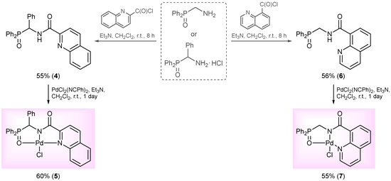 Synthesis of the isomeric phosphoryl-functionalized quinoline-substituted carboxamides and their Pd(II) pincer complexes.