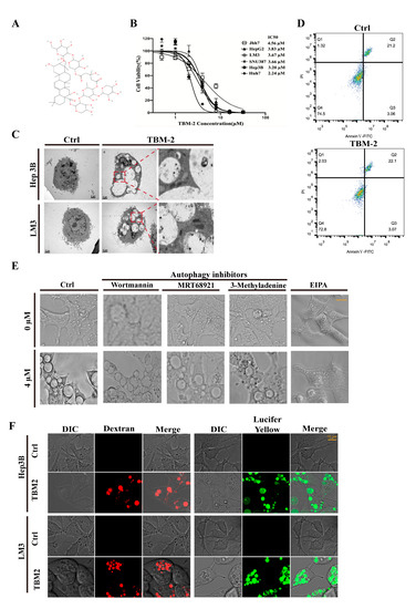 TBM-2, as one of the pharmacologically active components extracted from traditional Chinese herbs, has recently been reported as a potent anti-tumor molecule against several human cancer cell lines [21] (Figure 1A). To evaluate the inhibitory effect of TBM-2 on hepatocarcinoma cells, we first carried out a cell viability assay on six HCC cell lines: Hep 3B, Jhh-7, LM3, SNU387, Huh7, and Hep G2. All HCC cell lines showed a remarkable response to TMB-2 treatment with an IC50 range from 2.24 µM to 4.56 µM (Figure 1B). Intriguingly, extra-large vacuoles appeared in these HCC cells during TBM-2 treatment. Due to the most apparent vacuoles in LM3 and Hep 3B cells after TBM-2 treatment, we took LM3 and Hep 3B cell lines for further study. These impressive vesicles triggered by TBM-2 were encapsulated by a single-layer membrane rather than a bilayer membrane, as determined by transmission electron microscope (TEM) scanning (Figure 1C). As far as we know, phagosomes, similar with these large vesicles, only belong to specific cells [24]. Thus, we speculated that these single-layer membrane vacuoles might be either aberrant macropinosomes or dysfunctional autolysosomes. To determine whether these vesicles are auto-lysosomes, we introduced a flow cytometric assay with annexin V/propidium iodide (PI) staining to determine apoptosis and found that basal levels of apoptosis were present in the control group, while TBM-2 treatment did not enhance apoptosis (Figure 1D). Meanwhile, we also tried three autophagy inhibitors (3-methyladenine, Wortmannin, and MRT68921) to block the formation of the autolysosome. None of the three autophagy inhibitors prevented the formation of large vesicles when treated in combination with TBM-2 (Figure 1E). Further, we labelled Hep3B and LM3 cells after TBM-2 treatment with two specific macropinosome probes, fluorescent 70 kDa dextran dye and lucifer yellow [25,26], respectively. Moreover, these vesicles were, indeed, positively labelled by these two markers separately (Figure 1F), suggesting that these vesicles are derived from macropinosome. Moreover, EIPA, which specifically inhibits macropinocytosis rather than any other endocytosis processes, confers Hep 3B resistance to TBM-2 induced vacuolization (Figure 1E). Hence, we demonstrated that TBM-2 specifically triggers aberrant macropinocytosis, or methuosis as it is called, in hepatocarcinoma cells.