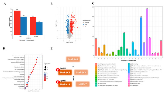 Phospho-proteomic analysis revealed the MAPK signal pathway. (A) Numbers of up- and downregulated proteins and phosphorylation sites after TBM-2 treatment. (B) Alterations in the phosphorylation level demonstrated as volcano plots with log2-transformed changes in protein abundance. T4 represents 4 µM TBM-2, and T0 refers to ctrl. (C) Comprehensive COG functional classification of phosphorylated proteins indicated significant upregulation of signal transduction, transcription and intracellular trafficking, secretion, and vesicular transport. (D) GO enrichment analysis of upregulated phosphorylated proteins surfacing from the MAPK signal pathway. (E) MAPK signal proteins that were detected with upregulated phosphorylation changes in functional sites.