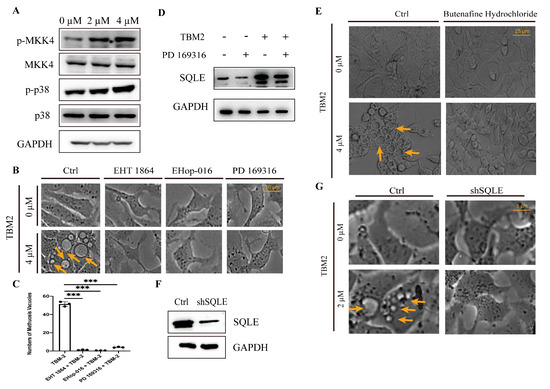 The MKK4–p38α axis mediated methuosis induced by TBM-2. (A) Representative Western blots of the MKK4–p38α axis in the TBM-2 treatment group and control group. Cells were cultured in equal numbers in a 6-well plate, treated for 24 h with indicated concentrations, and harvested for Western blot assay. (B) Morphological changes of cells that were pre-treated with the Rac1 inhibitors, namely, 5 µM EHop-016 and 20 µM EHT 1864, or the p38α inhibitor, 200 µM PD 169316, before being treated with TBM-2 for 24 h. Arrows indicate methuosis, Scale bars, 10 µm. (C) Number of methuosis vacuoles in cells that were pre-treated with the Rac1 inhibitors, namely, 5 µM EHop-016 and 20 µM EHT 1864, or the p38α inhibitor, 200 µM PD 169316, before being treated with TBM-2 for 24 h. *** p < 0.001 (D) Representative Western blots of squalene epoxidase, a key rate-limiting enzyme in cholesterol biosynthesis, after different treatments for 24 h. Concentrations of TBM-2 and PD 169,316 were 2 µM and 200 µM, respectively. (E) Phenotypes of cells that were pretreated with 200 µM squalene epoxidase inhibitor, butenafine hydrochloride, or DMSO and subsequently treated with TBM-2 for 24 h. Arrows indicate methuosis. (F) Western blots for validation of the knock-down of squalene epoxidase. (G) Phenotypes of cells with different protein levels of squalene epoxidase that were treated with or without TBM-2 for 6 h. Arrows indicate methuosis.